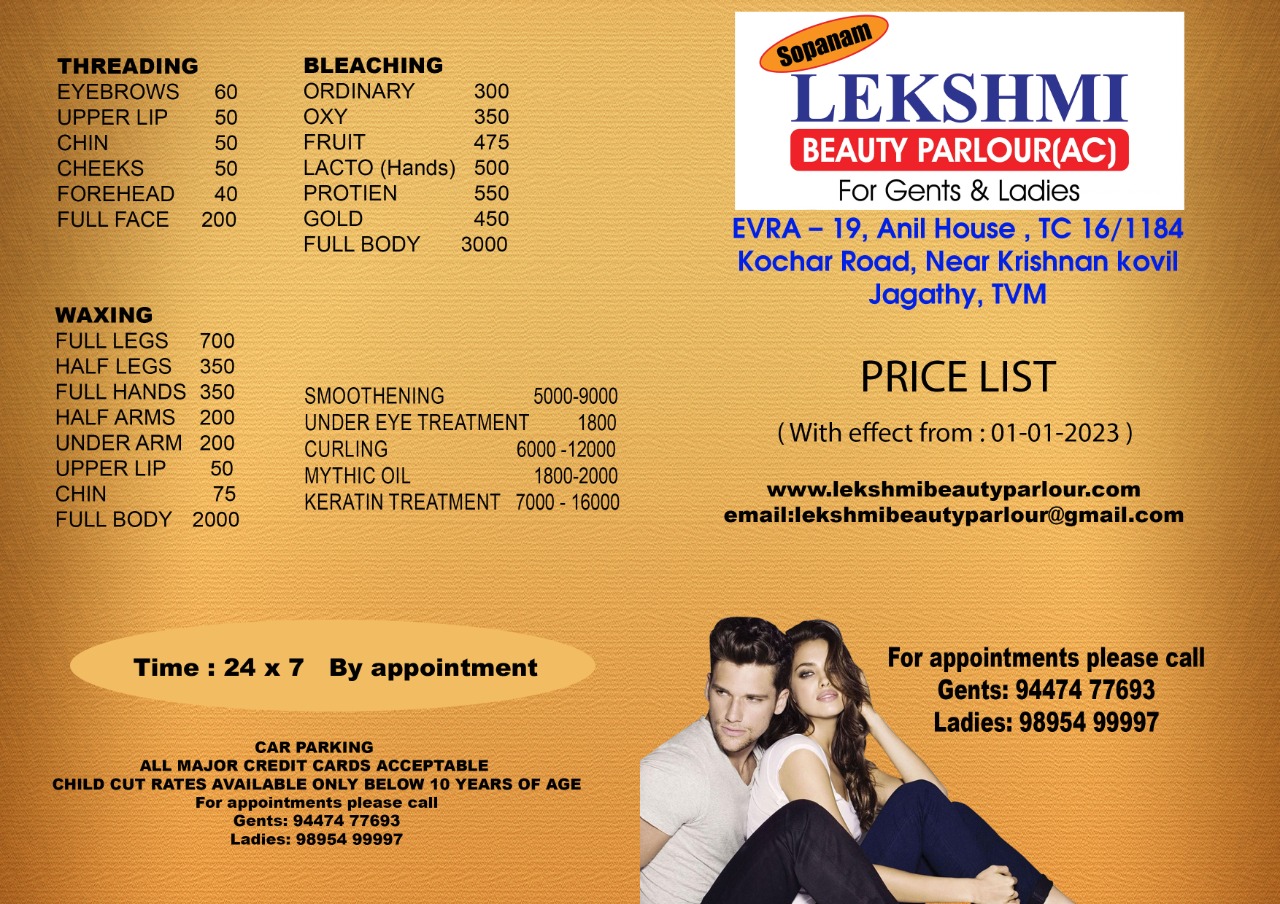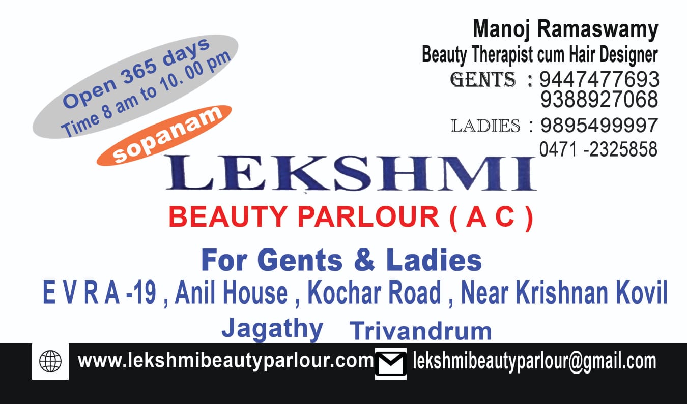 The beauty-conscious masses in the bustling city of Thiruvananthapuram can pamper their bodies, enrich their spirits, and nourish their hair at Lekshmi Beauty Parlour, run by Manoj Ramaswamy and his wife Sreelatha. They have gained extensive experience after working with hotels and private companies. In addition to the proprietor duo, the parlour boasts several professionally qualified employees. Lekshmi excels in its understanding of skin types and properties, employing detailed studies to enhance each individual’s appearance. Scientific methods are utilized to enhance the customer’s appearance.